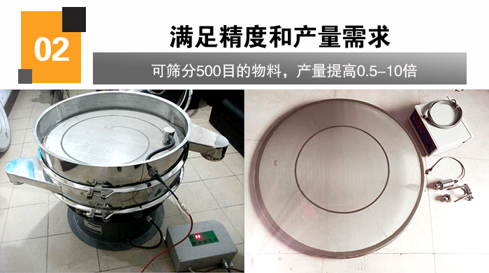 前面提到用戶的淀粉篩分精度為60目,篩分產(chǎn)量為120kg/分鐘。超聲波振動(dòng)篩可以篩分500目的物料,篩分精度比普通振動(dòng)篩提高80%以上,產(chǎn)量提高0.5-10倍,能清晰的分離直徑臨近的細(xì)微粉末。