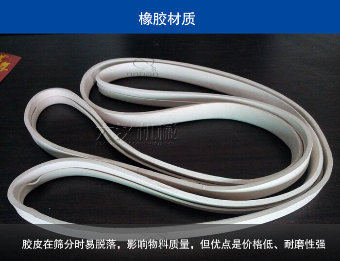 橡膠材質(zhì)的密封件中使用廣泛,,但在食品、化工類行業(yè)使用較少,因?yàn)橄鹉z本身對于物料會(huì)有一定的污染成分,膠皮在篩分時(shí)易脫落,會(huì)嚴(yán)重影響物料質(zhì)量,但其價(jià)格低、耐磨性強(qiáng),用戶在購買振動(dòng)篩應(yīng)根據(jù)物料的不同要求安裝合適的密封件。