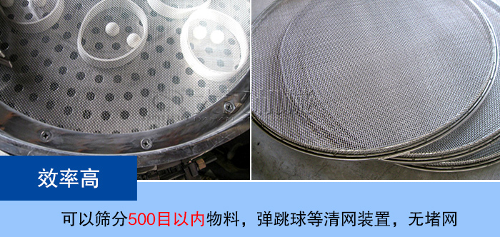 雙層旋振篩可以篩分500目以內(nèi)粉狀及顆粒狀物料,也可過濾5微米的漿液物料,篩分除雜效果好,,每小時可以處理1-5噸左右的物料,另外,我們的雙層旋振篩還加裝了彈跳球等清網(wǎng)裝置,設備無明顯的堵網(wǎng)現(xiàn)象,篩分效率高。