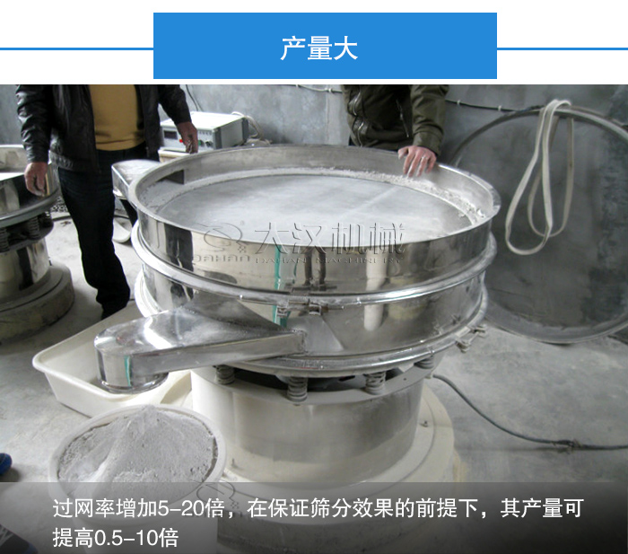 由于超聲波篩分系統(tǒng)的設(shè)計,我們的設(shè)備比不安裝超聲波的振動篩過網(wǎng)率增加5-20倍,在保證篩分效果的前提下,其產(chǎn)量可提高0.5-10倍。