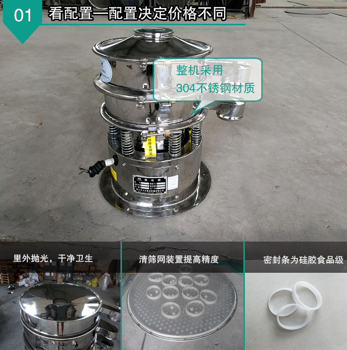 全不銹鋼振動(dòng)篩整機(jī)采用304不銹鋼材質(zhì),里外拋光,干凈衛(wèi)生,無(wú)毛刺,無(wú)死角,密封條為硅膠食品,彈簧外圍加304不銹鋼裙邊,同時(shí)還配備有專(zhuān)門(mén)的篩網(wǎng)清理裝置,可將堵網(wǎng)率降到低,過(guò)網(wǎng)率和處理精度得以有效提高。 看型號(hào)—型號(hào)決定價(jià)格不同