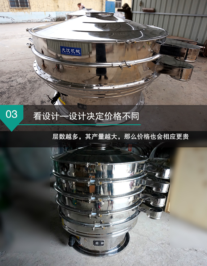 新鄉(xiāng)大漢全不銹篩振動(dòng)篩生產(chǎn)的直線(xiàn)振動(dòng)篩型號(hào)從DH600到DH2000,不同型號(hào)的全不銹鋼振動(dòng)篩,其直徑、篩網(wǎng)面積是不同的,所以這就決定了不同型號(hào)的全不銹鋼振動(dòng)篩產(chǎn)量是不同的,這也必然會(huì)造成全不銹鋼振動(dòng)篩價(jià)格上存在明顯的差異。 看設(shè)計(jì)—設(shè)計(jì)決定價(jià)格不同